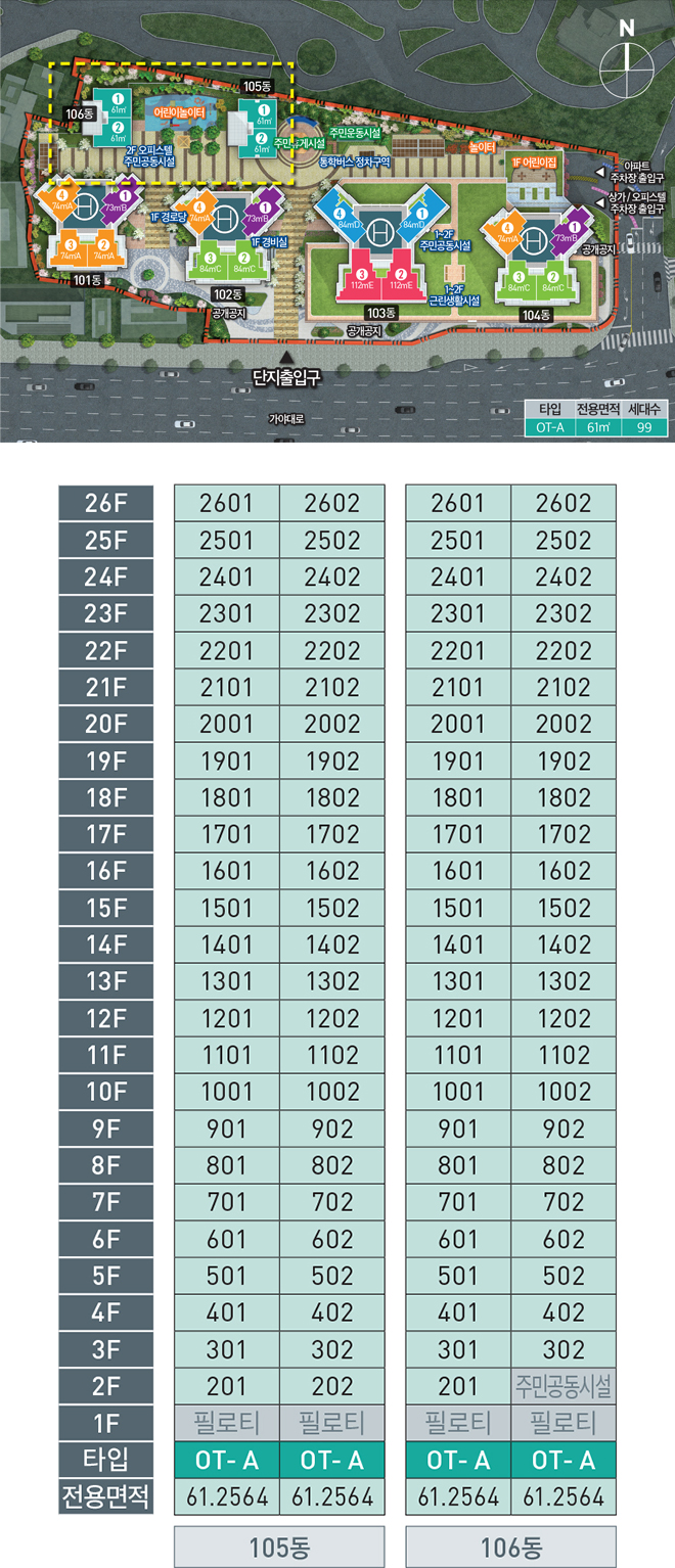 ※ 상기 단지배치도는 소비자의 이해를 돕기 위해 제작된 것으로 사실과 차이가 있으며 건물의 형태와 색채, 조경, 식재 등은 인·허가 과정 및 실제 시공 시 변경될 수 있으며 구획선과 시설물의 위치 및 규모는 측량결과 및 각종 평가에 따라 변경될 수 있습니다. ※ 상기 동·호 배치도는 소비자의 이해를 돕기 위한 것으로 제작과정상 오류가 있을 수 있으니 반드시 견본주택에서 확인하시기 바랍니다.